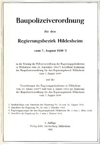 Vor Einführung der Niedersächsischen Bauordnung im Jahr 1974 existierten regionale Bauordnungen, wie z.B. die Baupolizeiverordnung für den Regierungsbezirk Hildesheim vom 07. August 1939, welche die Baupolizeiverordnung aus dem Jahre 1929 ablöste.